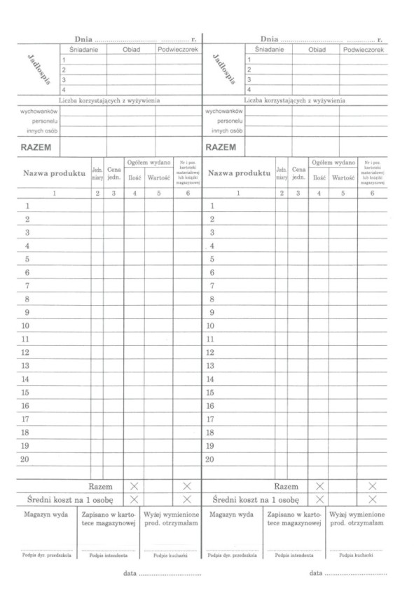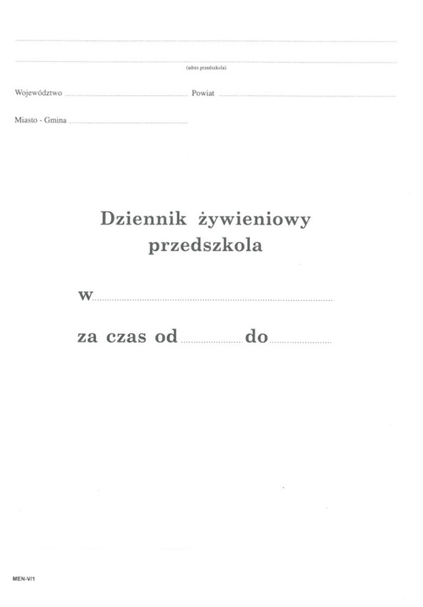Dziennik żywieniowy przedszkola, format A-4, 50 kartek oprawa miękka, papier offsetowy, druk dwustronny.
