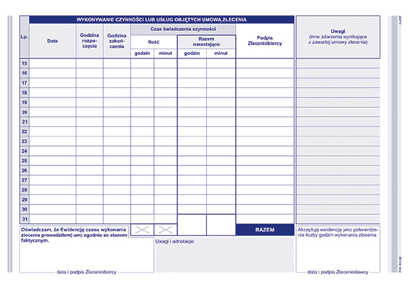 Ewidencja czasu wykonania umowy zlecenia. Format A5 papier offsetowy, bloczek 40 kartek, druk dwustronny.
