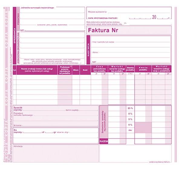 Faktura 2/3 z A4 dla Jednostek Organizacyjnych Samorządu Terytorialnego (oryginał+2kopie). Papier samokopiujący, bloczek 80 kartek.