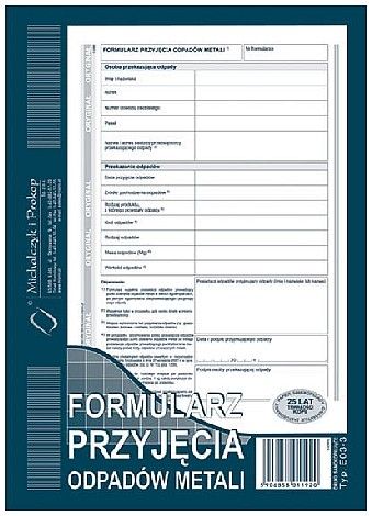 Formularz przyjęcia odpadów metali A-5 oryginał-kopia. Papier samokopiujący bloczek 80 kartek.