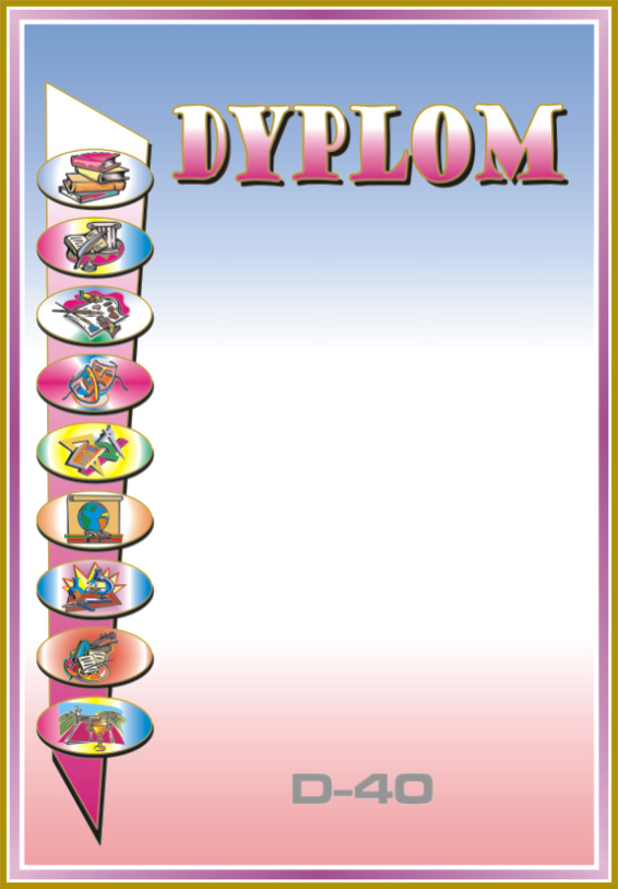 Dyplom edukacyjny w formacie A-4 wykonany na kartonie z fakturą płótna o gramaturze 185g. Drukowany na wysokiej klasy maszynach offsetowych, dyskretne złocenia podkreślają jakość produktu. Istnieje możliwość wykonania na dyplomie dodruku tekstu grafiki zgodnie z Państwa projektem.