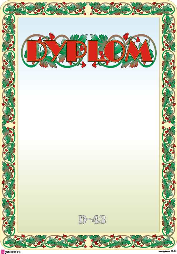 Dyplom ogólny w formacie A-4 wykonany na kartonie z fakturą płótna o gramaturze 185g. Drukowany na wysokiej klasy maszynach offsetowych, dyskretne złocenia podkreślają jakość produktu. Istnieje możliwość wykonania na dyplomie dodruku tekstu grafiki zgodnie z Państwa projektem.