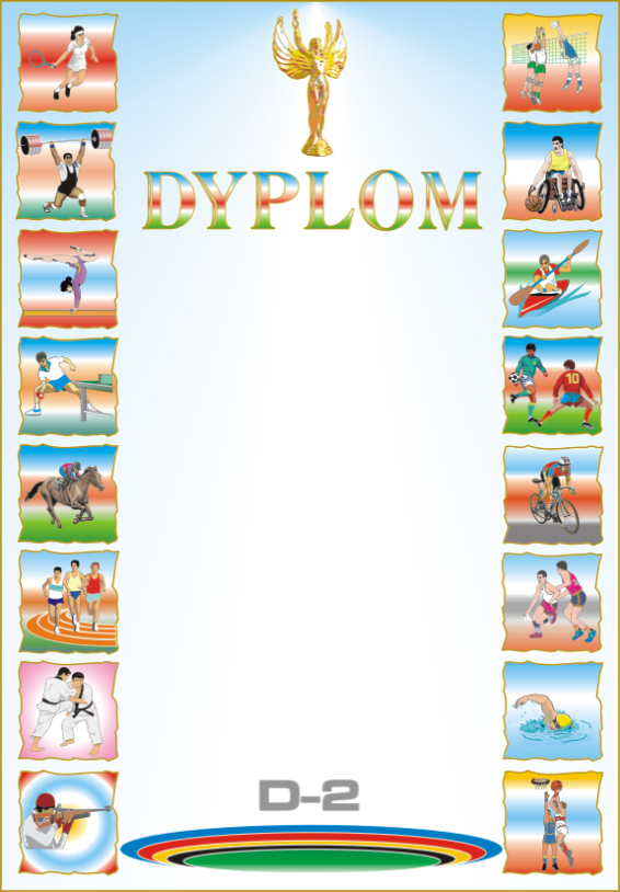 Dyplom sportowy w formacie A-4 wykonany na kartonie z fakturą płótna o gramaturze 185g. Drukowany na wysokiej klasy maszynach offsetowych, dyskretne złocenia podkreślają jakość produktu. Istnieje możliwość wykonania na dyplomie dodruku tekstu grafiki zgodnie z Państwa projektem.