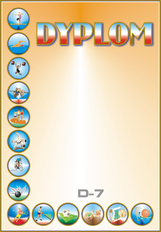 Dyplom sportowy w formacie A-4 wykonany na kartonie z fakturą płótna o gramaturze 185g. Drukowany na wysokiej klasy maszynach offsetowych, dyskretne złocenia podkreślają jakość produktu. Istnieje możliwość wykonania na dyplomie dodruku tekstu grafiki zgodnie z Państwa projektem.