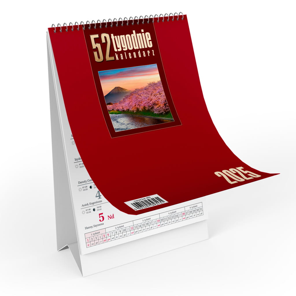 Kalendarz stojący na biurko o wymiarach 14×19,5cm. 28 stron wykonanych z papieru ekologicznego o gramaturze 70g/m2. Jeden tydzień na jednej stronie, w dolnym rogu skrócony kalendarzyk miesiąca. Spirala biała, podstawka o profilu trójkątnym, karton 350g/m2, jednostronnie bielony zapewnia stabilność, wytrzymałość, a także dużą estetykę.