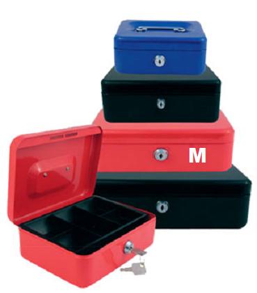 Metalowe kasetki lakierowane zamykane na kluczyk. Wewnątrz posiadają plastikową wkładkę na bilon. Dostępne w 3 kolorach: czarnym, czerwonym i niebieskim. Rozmiar M wymiary 82x262x192mm