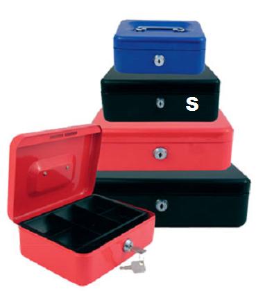 Metalowe kasetki lakierowane zamykane na kluczyk. Wewnątrz posiadają plastikową wkładkę na bilon. Dostępne w 3 kolorach: czarnym, czerwonym i niebieskim. Rozmiar S wymiary 77x207x157mm