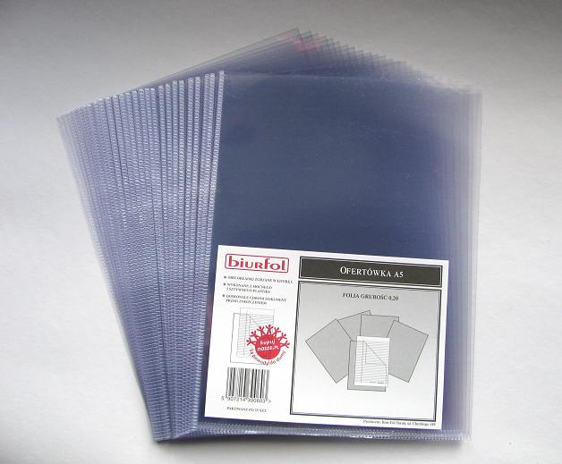 Ofertówka A-5 wykonana z wysokiej jakości folii PCV, o bardzo wysokiej przezroczystości. Zgrzana w kształt litery L. Grubość folii: 0,20 mm.