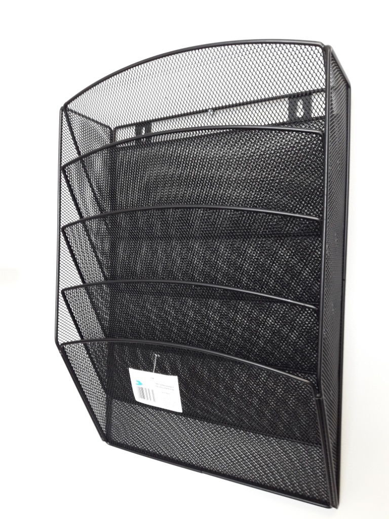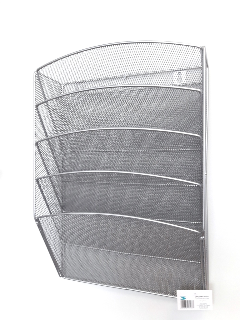 Metalowa lakierowana półka na dokumenty A-4 z pięcioma poziomymi przegrodami. Idealnie nadaje się do prezentacji ulotek, folderów, katalogów firmowych oraz do uporządkowania korespondencji wewnątrz firmy. Montaż na ścianie za pomocą kołków dostarczonych w komplecie.