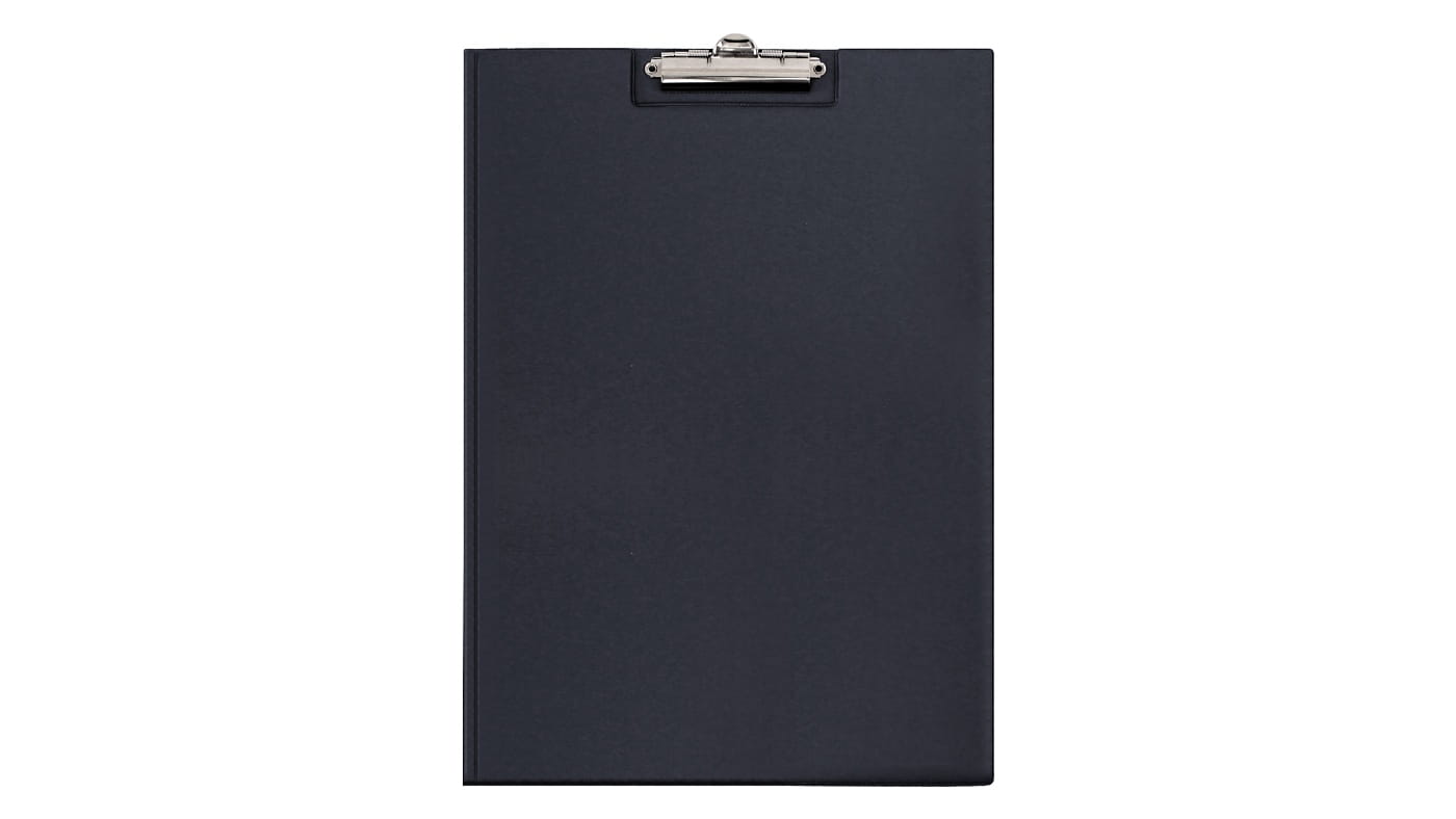 Sztywne okładki, sprężysty zacisk do przytrzymywania papieru, kieszeń na wewnętrznej stronie okładki i uchwyt na długopis.