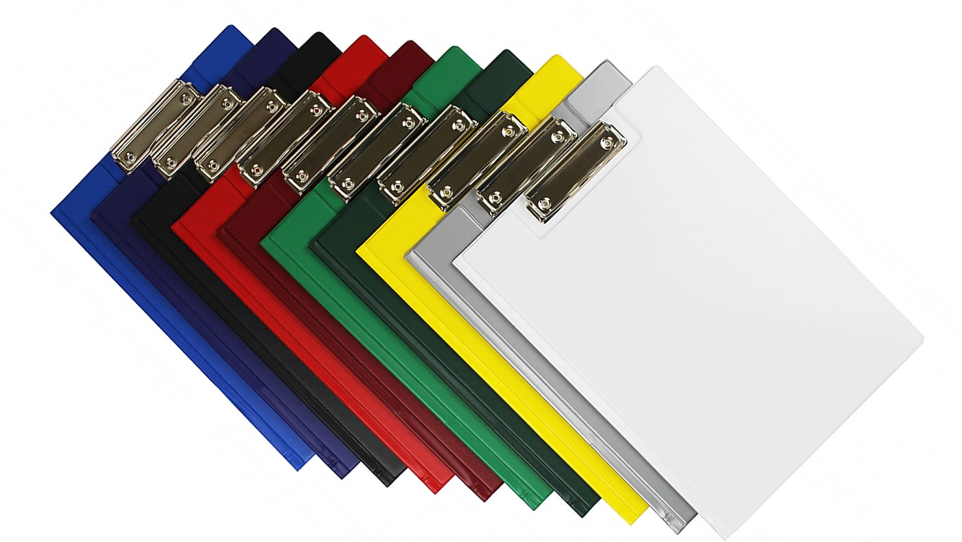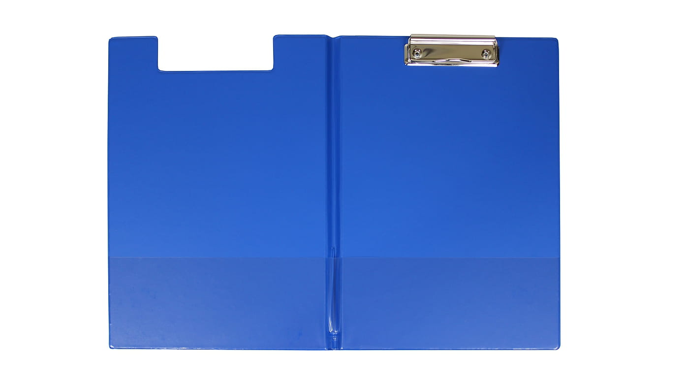 Sztywne okładki, sprężysty zacisk do przytrzymywania papieru, kieszeń na wewnętrznej stronie okładki i uchwyt na długopis.