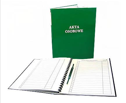 Teczka bindowana wewnętrznie, na grzbiecie okładki miejsce do opisu. 4 sztuki przekładek personalnych ABCD (wg. wzoru kodeksu pracy), oraz wąsy do wpinania dokumentów.