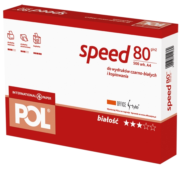 Papier POLSPEED A4 80g 500 arkuszy, białośc CIE 146. Standard wysokich nakładów. Przeznaczony do wysokonakładowych drukarek i kopiarek. Optymalna sztywność zapewnia niezawodne i szybkie działanie urządzeń. Technologia ColorLok gwarantuje błyskawiczne wysychanie druku oraz pogłębione odcienie czerni. Idealny do czarno-białych codziennych dokumentów i korespondencji wewnętrznej.