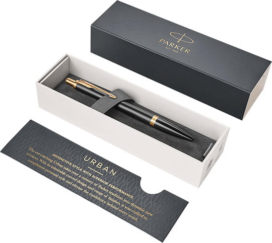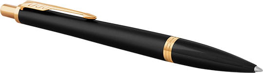 Wykonany z mosiądzu korpus długopisu pokryty warstwą czarnego matowego lakieru. Wykończenia platerowane w kolorze złota. Wyposażony w obrotowy mechanizm wysuwania wkładu, etui.