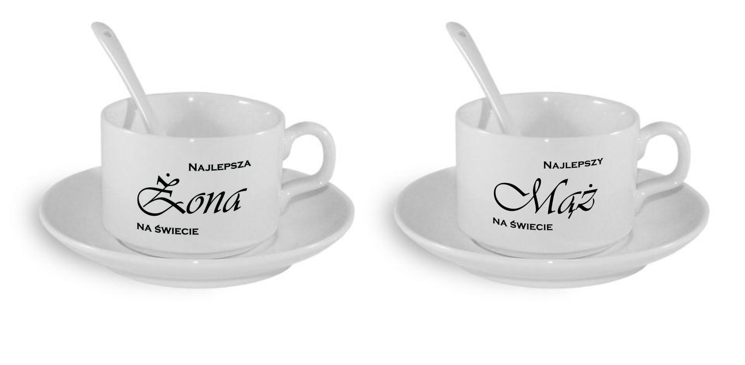 Zestaw dwóch filiżanek ceramicznych o pojemności 150 ml z nadrukiem, talerzykiem, pakowane w białe techniczne kartoniki. Nadruk wykonany po obu stronach filiżanki.