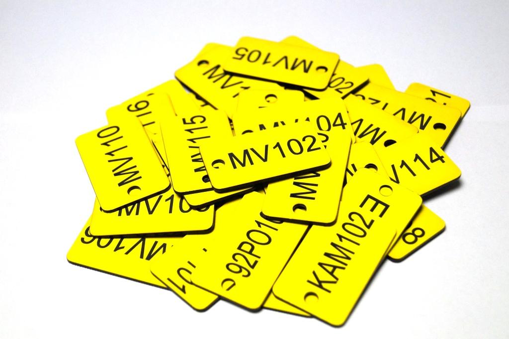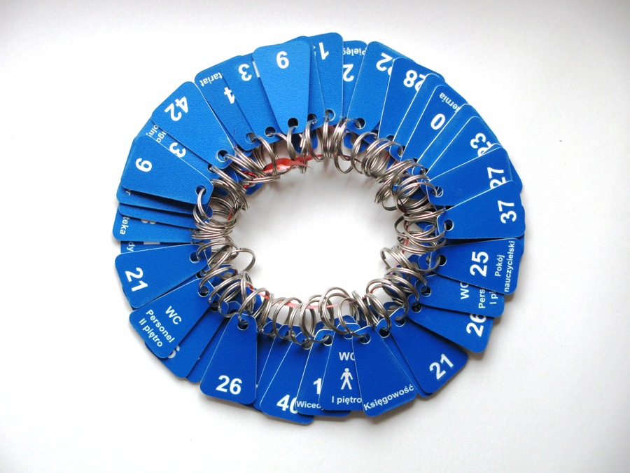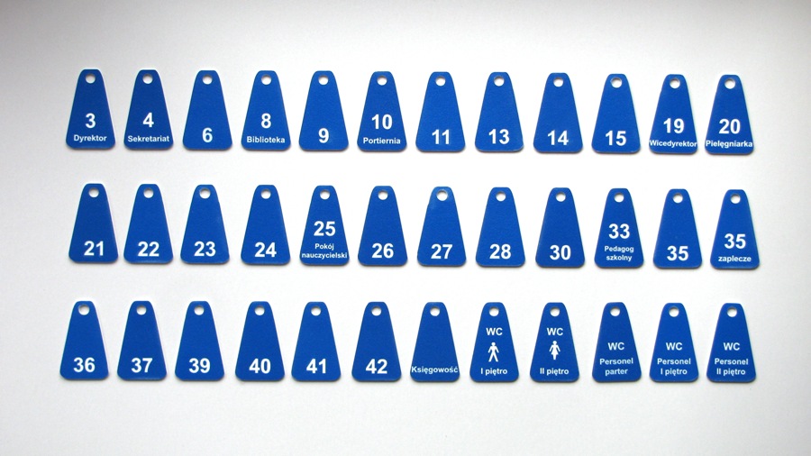 Breloczki do kluczy o wymiarze 55x35mm wykonane z niebiesko-białego przemysłowego laminatu odpornego na ścieranie i promienie UV. Kształt, wielkość, kolor, tekst, logo, dowolne w/g zamówienia.
