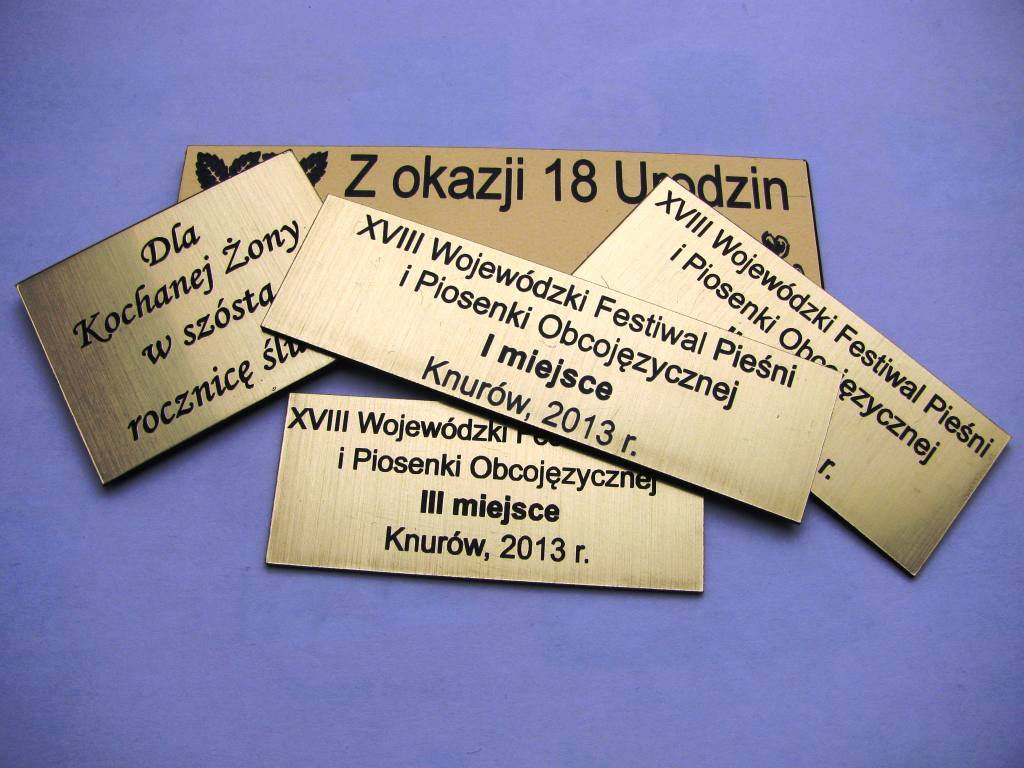 Wykonujemy grawerowane laserowo tabliczki opisowe na trofea, puchary, pamiątki, tabliczki znamionowe, tabliczki,wizytówki i numery na drzwi , tablice pamiątkowe, szyldy.