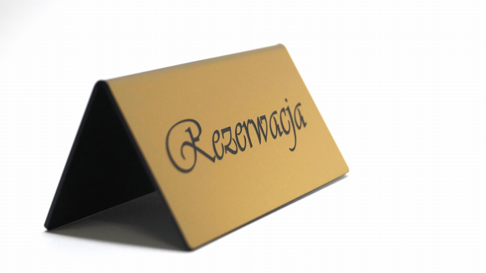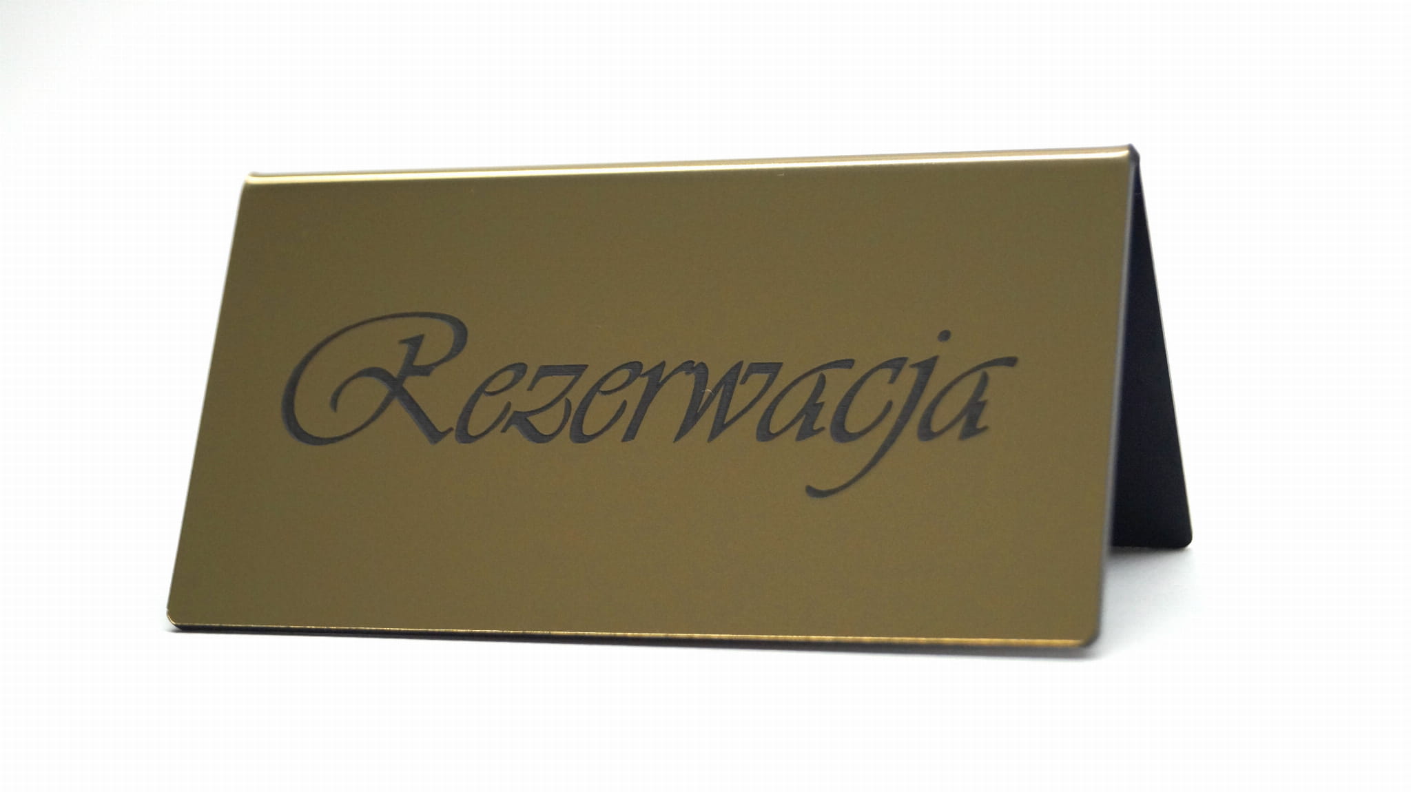 Grawerowana i wycinana laserowo tabliczka na stół REZERWACJA. Wykonana z wysokiej jakości laminatu grawerskiego o grubości 1,6 mm w kolorze szczotkowanego złota.