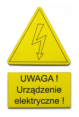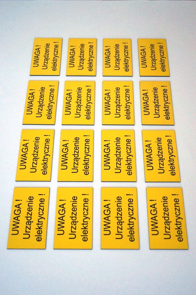 Tabliczka o wymiarach 15x10cm wykonana z żółto-czarnego laminatu. Kształt, kolor, tekst, logo, dowolne w/g zamówienia.