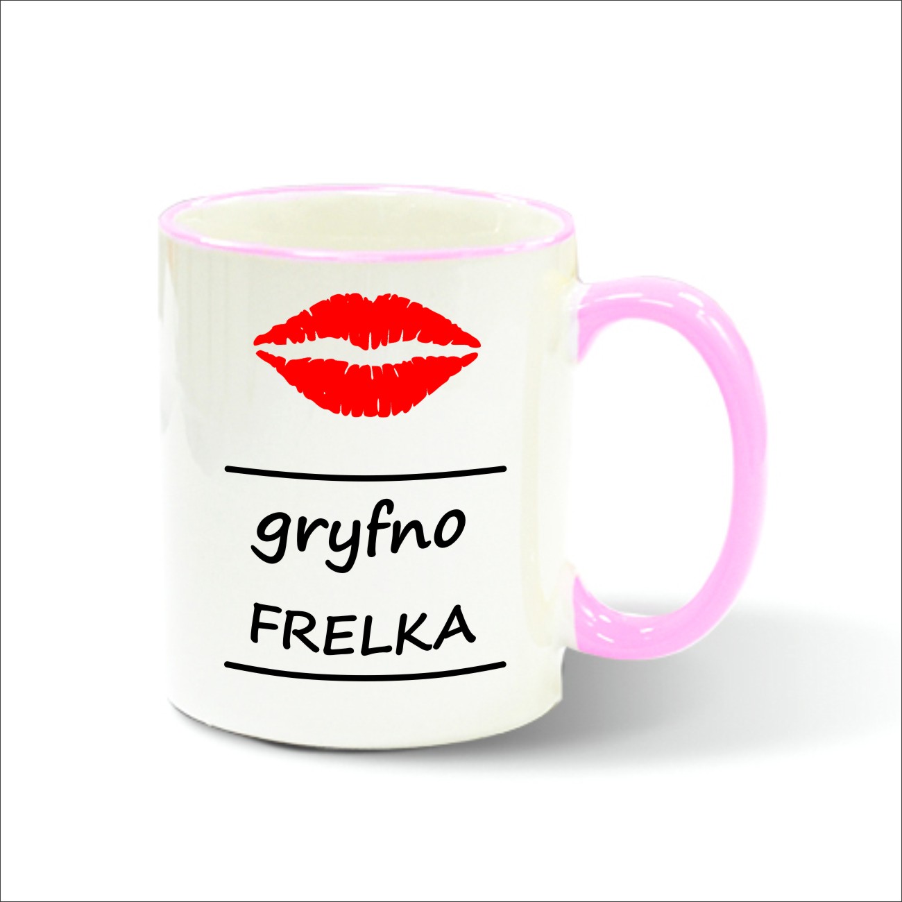 Kubek  – GRYFNO FRELKA biały z różowym uszkiem o pojemności 330 ml z dwustronnym nadrukiem.
