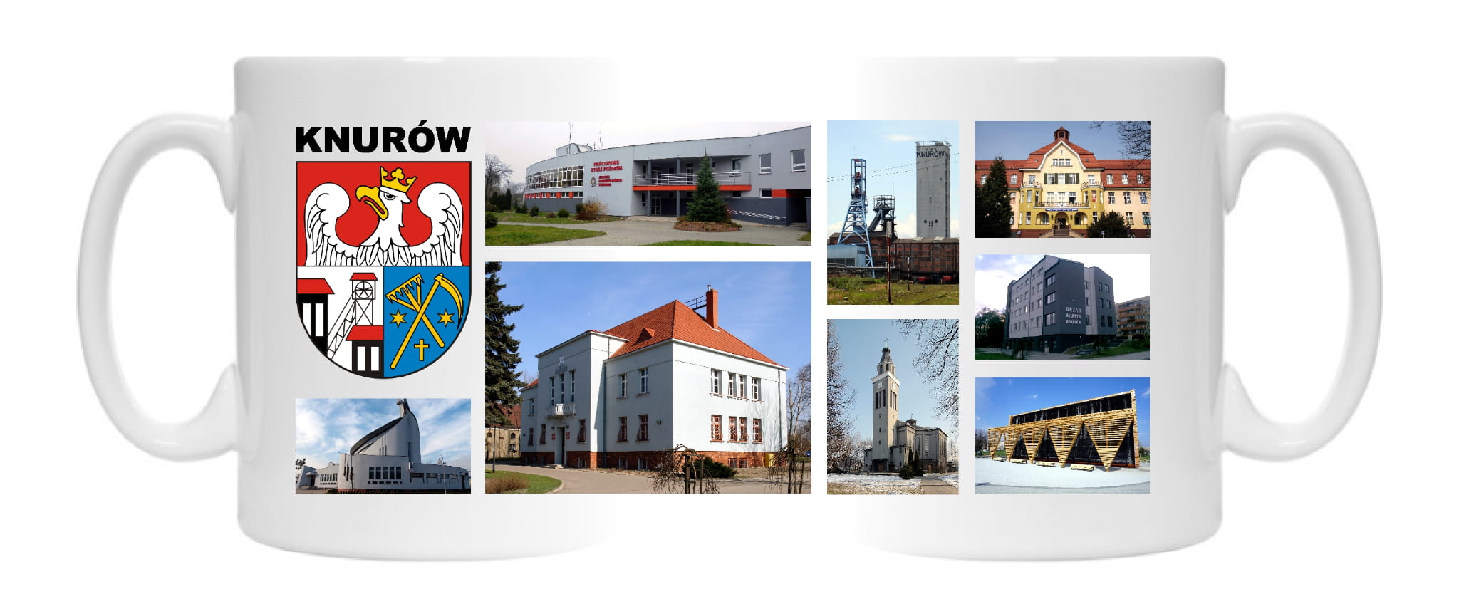 Kubek KNURÓW – biały o pojemności 330 ml z dwustronnym nadrukiem.