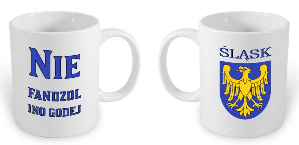 Kubek ŚLĄSK – biały o pojemności 330 ml z dwustronnym nadrukiem.