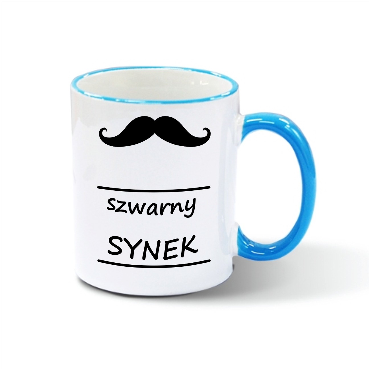 Kubek – SZWARNY SYNEK biały z niebieskim uszkiem o pojemności 330 ml z dwustronnym nadrukiem.
