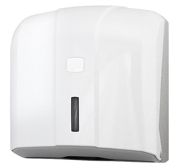 Pojemnik na ręczniki Z-Z wykonany z tworzywa ABS w kolorze białym. Pojemność 500 listków. Zamykany na kluczyk. Okienko do kontroli ilości ręczników.