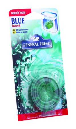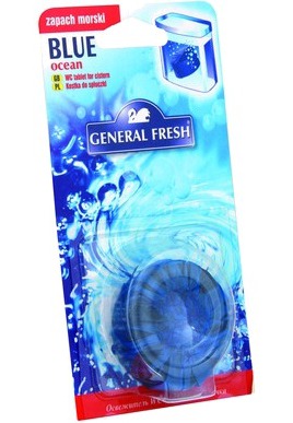 GENERAL FRESH kostka do spłuczki BLUE zawiera specjalnie dobrane składniki, które po każdorazowym spłukaniu czyszczą muszlę klozetową również pod jej obrzeżem, gdzie bakterie i zarazki gromadzą się najczęściej. Zabarwiona, pieniąca się woda długo utrzymuje świeżość oraz pozostawia przyjemny zapach.