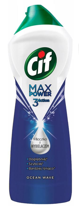 Cif Max Power mleczko wybielające Ocean Wave służy do usuwania ciężkich zabrudzeń. Mleczko do czyszczenia ma właściwości wybielające.W jego składzie znajduje aktywny chlor, dzięki któremu skutecznie usuwa trwałe zabrudzenia w łazience, kuchni, ogrodzie, na zewnątrz domu, takie jak osady z wody, przypalony tłuszcz, pleśń. Nie powoduje zarysowań, czyszczone powierzchnie pozostawia bez smug i zacieków.