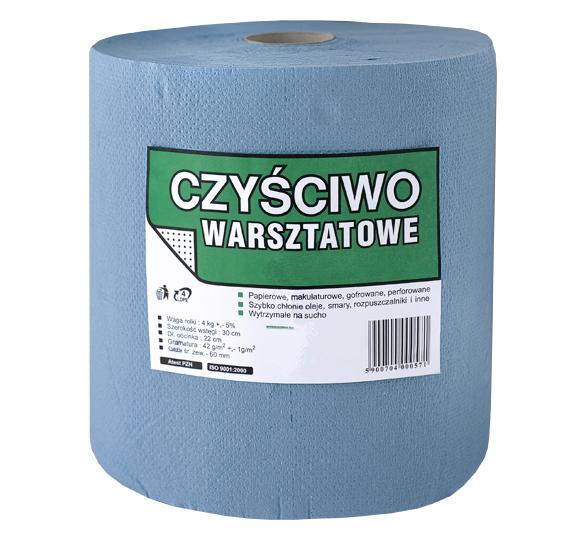 Czyściwo makulaturowe jednowarstwowe, gofrowane, ogólnego zastosowania w kolorze niebieskim. Szybko chłonie oleje, smary, rozpuszczalniki i inne. Wytrzymałe na sucho. Średnica rolki 30cm, wymiary listka 22x30cm, ilość listków 1500, długość 330mb. Waga 4kg +/- 5%
