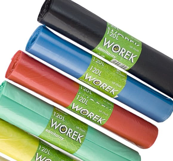 Worki do segregacji odpadów o pojemności 120l. Wykonane z folii LD. Dostępne w kolorach: żółtym, niebieskim, zielonym, brązowym i czarnym.