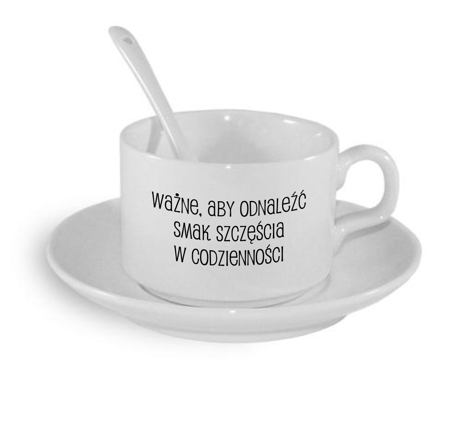 Filiżanka z nadrukiem WAŻNE ABY ODNALEŹĆ SMAK SZCZĘŚCIA W CODZIENNOŚCI